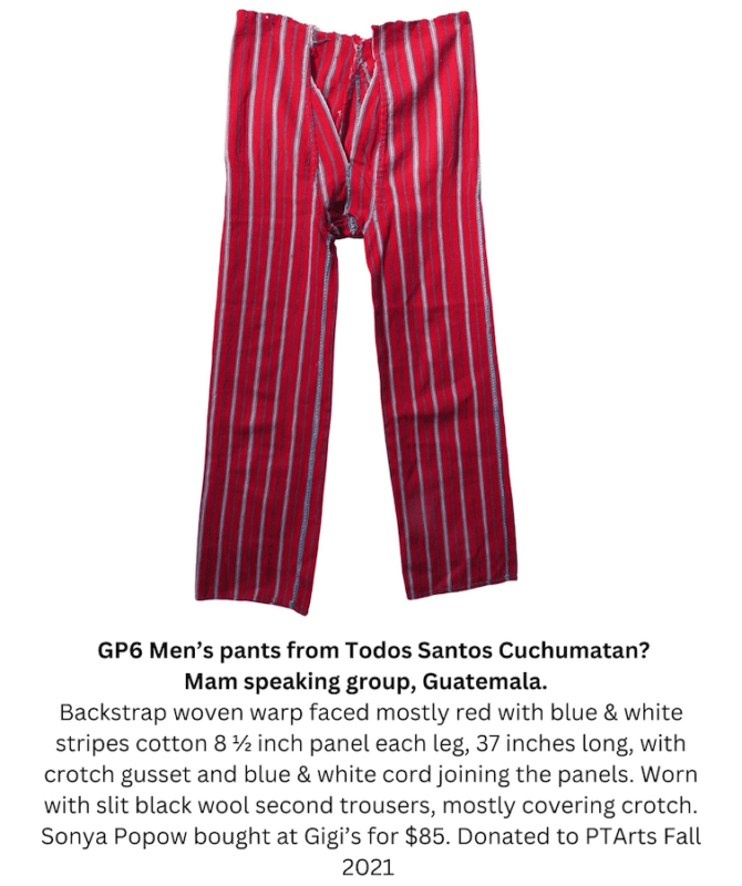 The PTArts Textile Study Collection started with the donation of largely ‘ethnic’ textiles that Lolli Jacobsen has amassed to illustrate aspects of the Textile History class she taught. These pieces were collected at thrift shops, conferences and stores, received as gifts, and collected while traveling over 50 years. The original collection has been augmented by generous donations from individuals and estates. With the help of resources in the PTArts library and individuals with expertise in the community Lolli is documenting the collection. Volunteers are welcome to help with this effort and will receive individual instruction about the textiles being worked on and/or exhibited. The collection is available by appointment and occasional gallery shows.