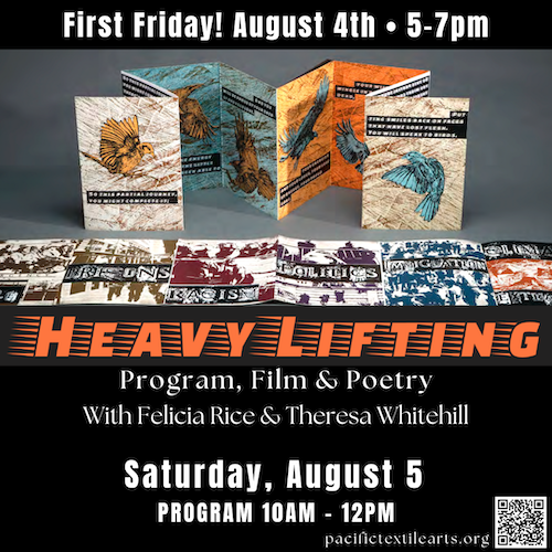 The Heavy Lifting Listening Tour aspires to offer opportunities for healing, and dreaming, through dialogue. An introduction to the project opens a display of the artists’ book and of the experimental film, On Heavy Lifting, that accompanies the book. This is followed by a conversation between poet Theresa Whitehill  and the audience in which she alternates reading her poems with an invitation for audience members to read their own work or share brief stories in response to the themes and material.