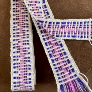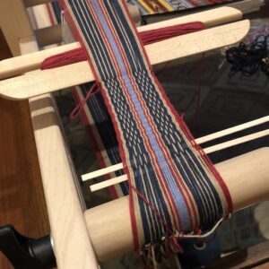 As an introductory class, we’ll start with some design basics, a starter pattern, and selecting colors for a band. You will gain the skill of making heddles and then threading heddled and unheddled warp threads on the loom. This will include learning how to change the colors of your warp threads and weaving from a pattern. Then, we’ll weave our first band by winding a shuttle, making sheds with the engagement of heddled and unheaddled threads, and beating in the weft. Optionally, you’ll learn some basic pick-up techniques to enhance your design. Lastly, we’ll take our bands off the loom, seam them so they don’t fray, and make a key fob.