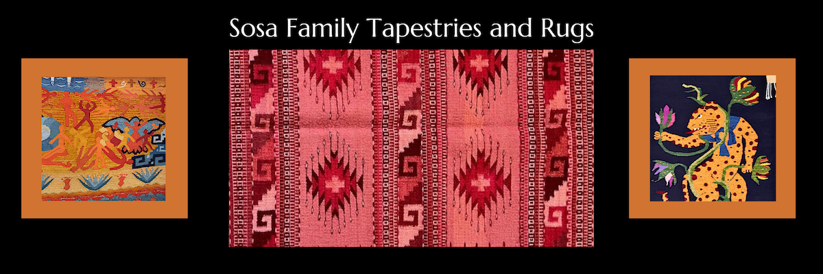 Sosa family textiles from Teotítlan del Valle, Oaxaca. July 1, 5-8pm: An Evening with Rodrigo Sosa  Bautista – Gallery exhibit of rugs and tapestries from the Sosa family of Teotítlan del Valle, Oaxaca, Mexico. Rodrigo is a Zapotec weaver from the famed rug and tapestry weaving village of Teotitlan Del Valle. He will be representing his family. Rodrigo is the fourth generation in his family to carry on the centuries old tradition of spinning ,dyeing, and weaving tapetes(rugs) he has been weaving since he was 8 years old. His handwoven designs are based on traditional diamonds,stars, little eyes, shapes along with decorative bands of grecas patterns (geometrical motifs) of prehistoric origin.